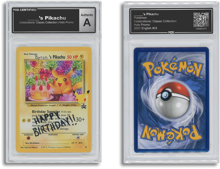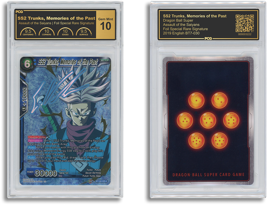 A PCG Signature is a card that has been signed by an athlete, voice actor, or designer of the card. The authenticity of the signature will be verified. If the signature does not meet the standard expected within the TCG (Trading Card Game) community, it will be noted as a mark on the card, which may impact the overall grade.