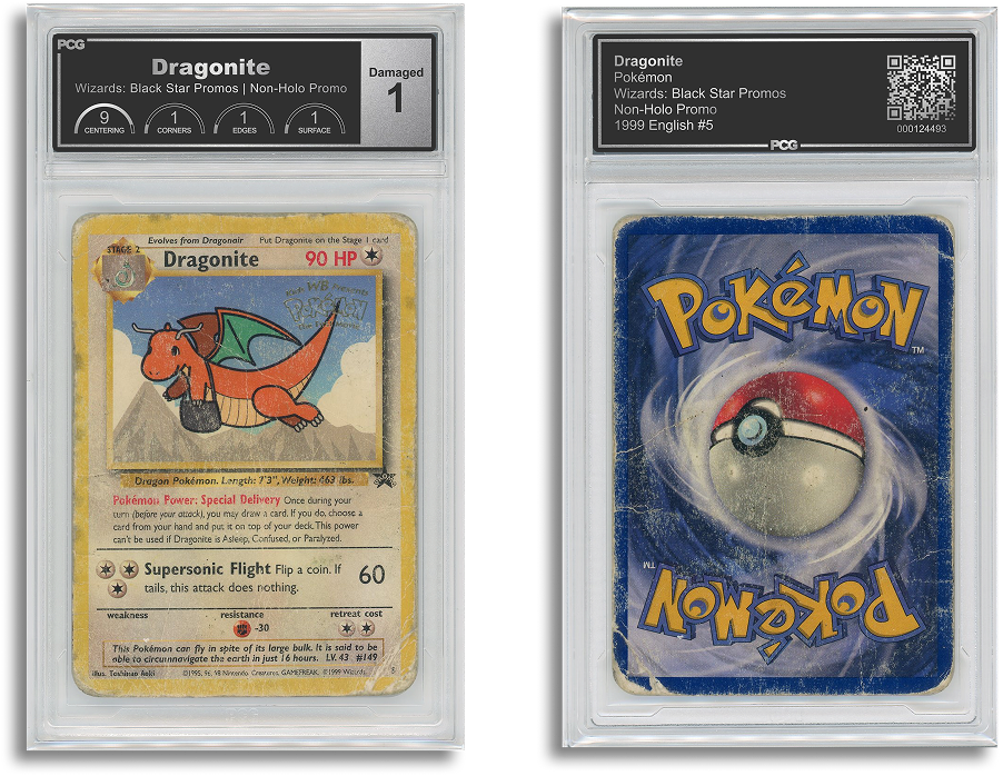 A PCG Damaged 1 is a card with excessive damage and very little eye appeal. The card will show heavy damage, including major scratches, dents, and multiple large and small creases. Significant chipping and discolored edges will be evident, with heavily damaged rounded corners. All gloss will be absent from both the front and back of the card, and it may feature dirt, stains, or missing areas. There are no centering requirements for this grade.