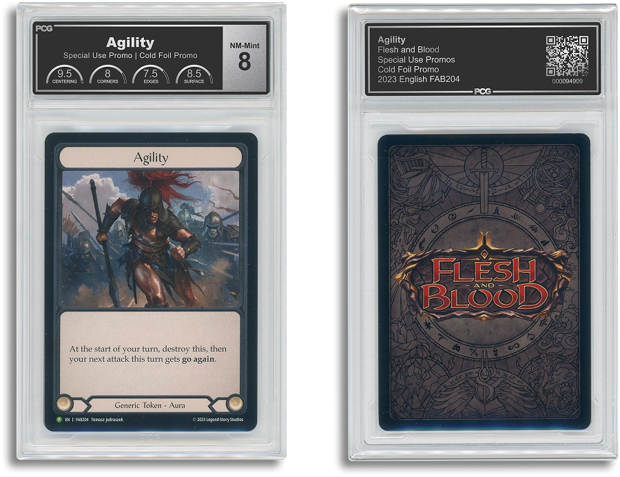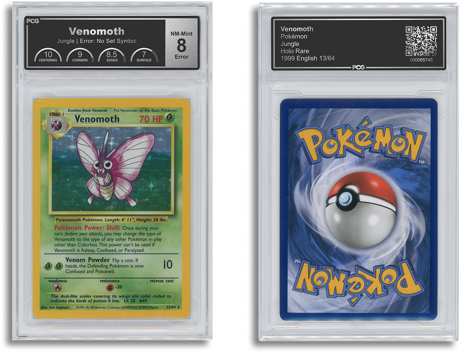 A PCG NM-Mint 8 is a card in excellent condition, with some slight imperfections that impact the overall high level of eye appeal. The card may show minor wear on the corners and edges or display small wax stains and printing defects. The centering must be within a 60/40 or 65/35 ratio on the front, and 80/20 or better on the back.
