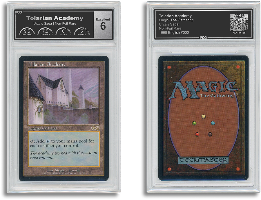 A PCG Excellent 6 is a card in excellent condition, with noticeable imperfections across multiple categories that impact the overall eye appeal. The card may show wear and light scratches on the surface, slightly rounded corners, small amounts of whitening on the edges, and visible small wax stains or printing defects. The centering must be within a 70/30 ratio on the front and 90/10 or better on the back.