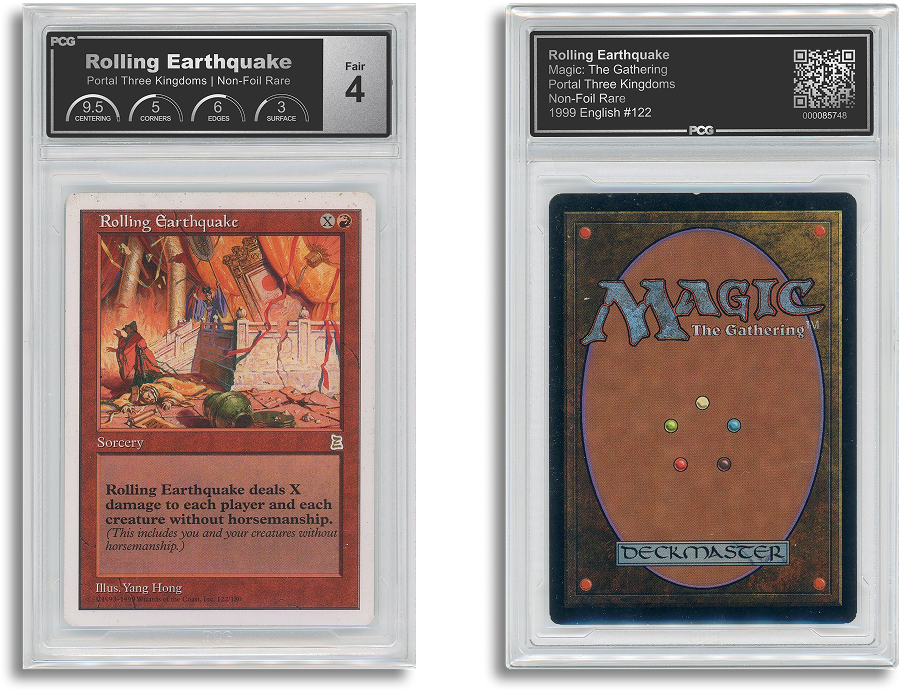 A PCG Fair 4 is a card with moderate wear visible to the naked eye and a significant increase in imperfections across multiple categories. The card may exhibit wear, including scratches, dents, small creases on the surface, chipped edges, rounded corners, and scrapes or scuff marks that could affect the original gloss. The centering must be within an 80/20 ratio on the front, with any centering on the back considered acceptable.