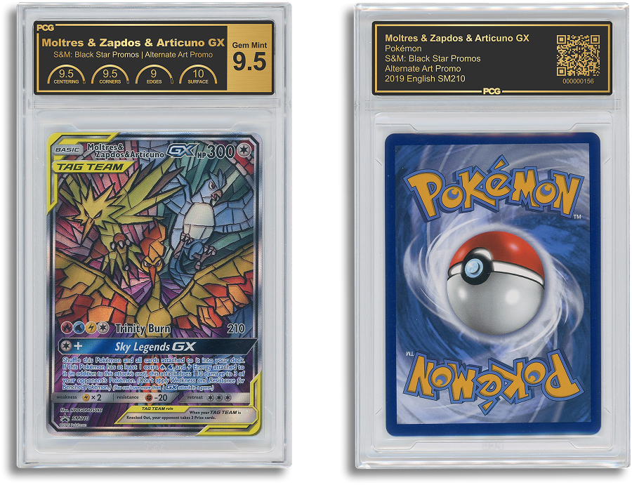 A PCG Gem Mint 9.5 is a card that slightly falls short of meeting the eye appeal standards of a Pristine 10. The centering of the card must be within a 50/50 ratio one way and 55/45 the other way on the front, with 60/40 or better on the back.
