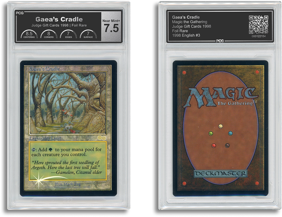 A PCG Pristine 10 is a nearly flawless card, with only a minor visible imperfection in one of the subgrade categories, which does not detract from the overall high level of eye appeal. The card must retain sharp focus and its original gloss, with no stains and four sharp corners. The centering must be within a 50/50 ratio on the front, and 60/40 or better on the back.
