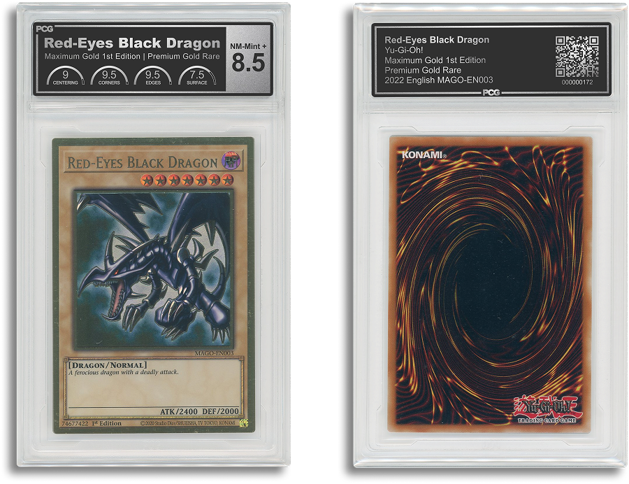 A PCG NM-Mint+ 8.5 is a card that just falls short of meeting the requirements and eye appeal of a Mint 9. The centering of the card must be within a 60/40 ratio on the front and 70/30 on the back.
