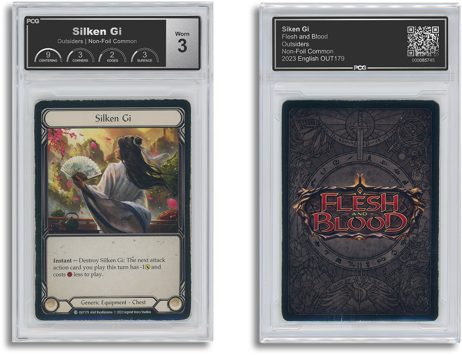 A PCG Worn 3 is a card with significant visible wear and noticeable damage across multiple categories. The card will show signs of deterioration, including a range of scratches, dents, and larger creases on the surface. Chipped and discolored edges will be visible, with blurry images and rounded corners. A majority of the gloss will be missing from the card. The centering must be within an 85/15 ratio on the front, with any centering on the back considered acceptable.
